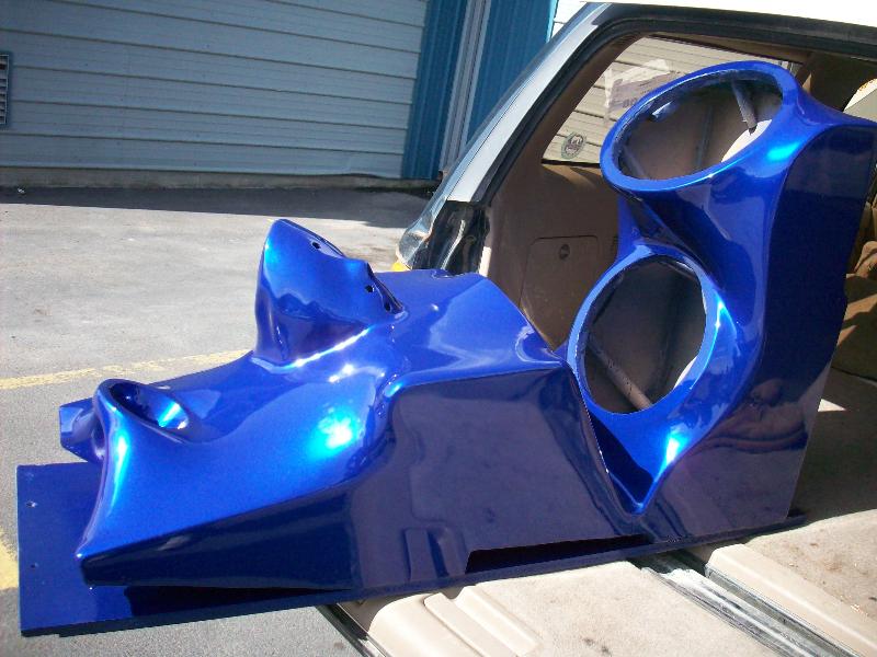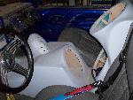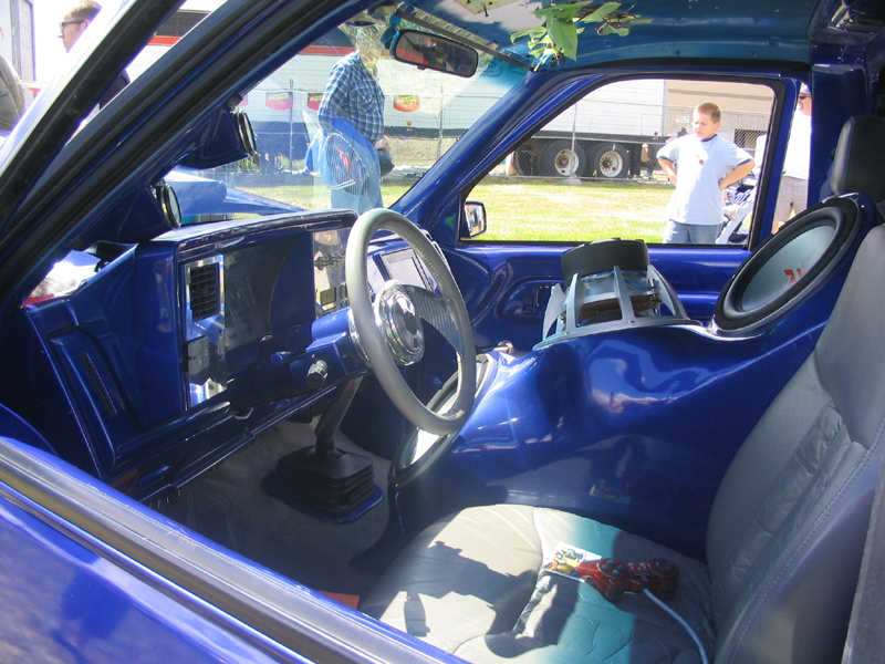 smoothed and painted dash, 95 door pannels, yukon plastics all smoothed and painted, grey leather buckets, and steering wheel, lots of billet, 7"screen in the glove box 6.5 screen in the headliner fiberglass box for the tree twelves and switches