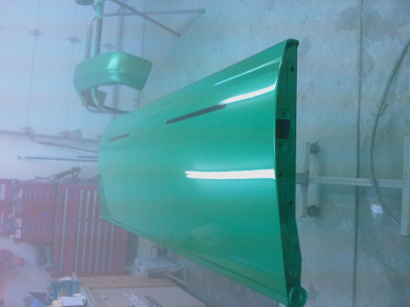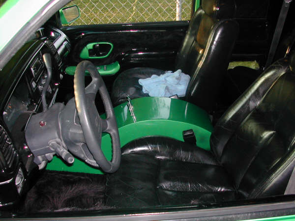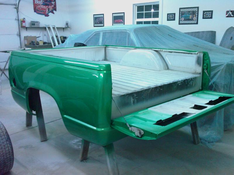 PPG electra green, with HOK grren ice pearl. Shaved clean with 15" led tails, Old school cowl hood. Blacked out phantom grill,