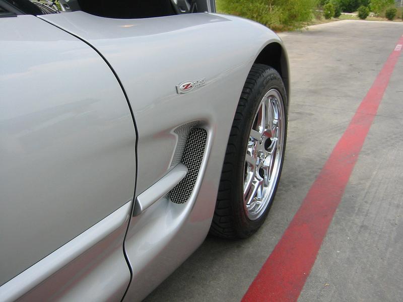 Quiksilver HT Zo6 with sidescoop screens and front brake inlet screens, cross drilled/slotted rotors with ceramic pads, Laser cut stainless steel front & rear bumper letters, Z06 exhaust plate. Chrome shorty attenna.
