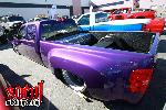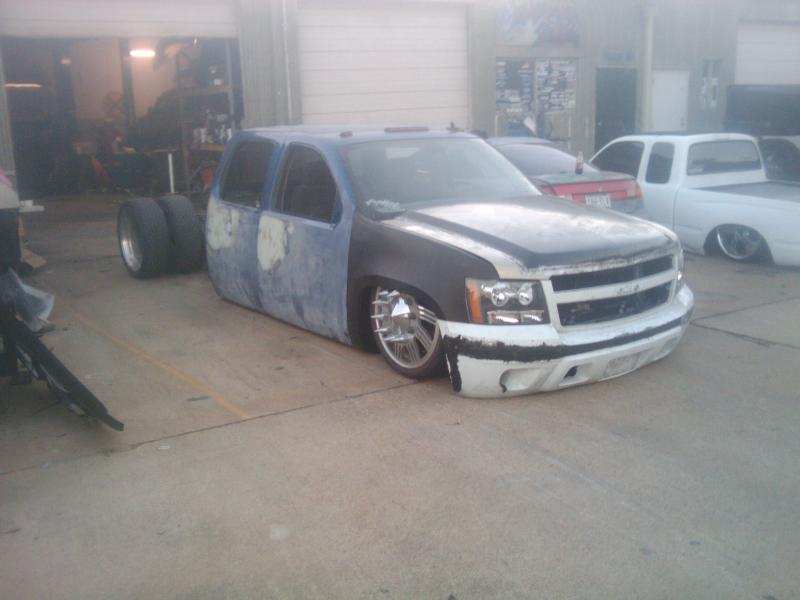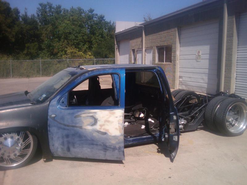 tahoe front end conversion body dropped fully shaved suicide rear doors huge rag top house of kolro pavo purple paint job custom hood 06 chevy hood bubble grafted into tahoe hood