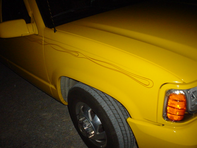 escalade frontend,cadillac tail lights, shaved tailgate handle, billet grille, clear corner lights, red pinstripe flames, custom yellow paint job