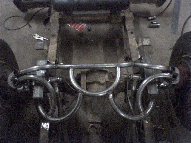 Z'd frame, remade control arms, drop spindles, stock floored, crushed on the rockers. 4-link rear, tubular bridge for gooseneck ball and bag mounts. Engine driven compressor, 3/8 valves