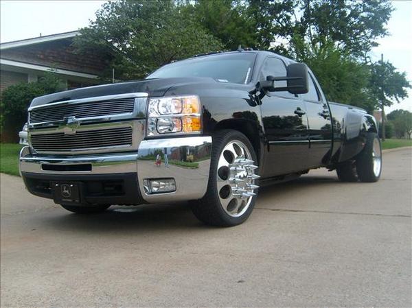 smoked lights, billet grille bowtie and antenna, spray-in liner, custom one off b&w gooseneck hitch, hid lights