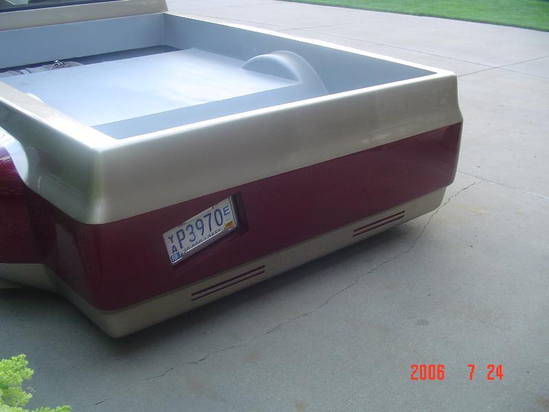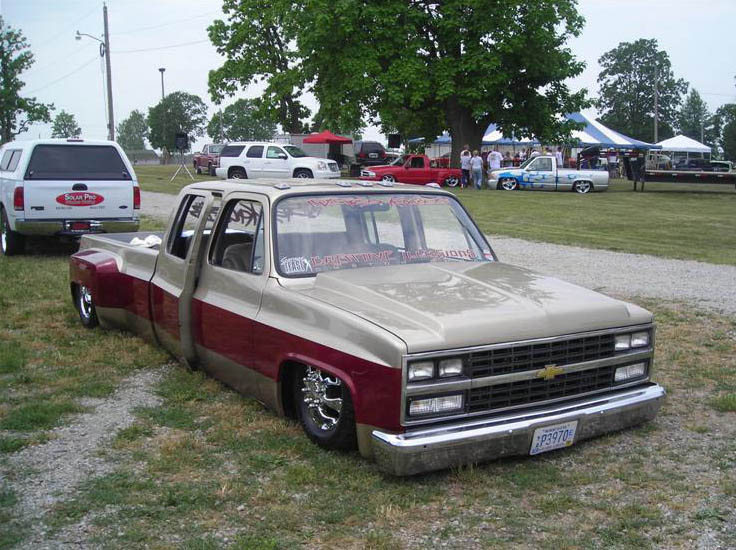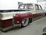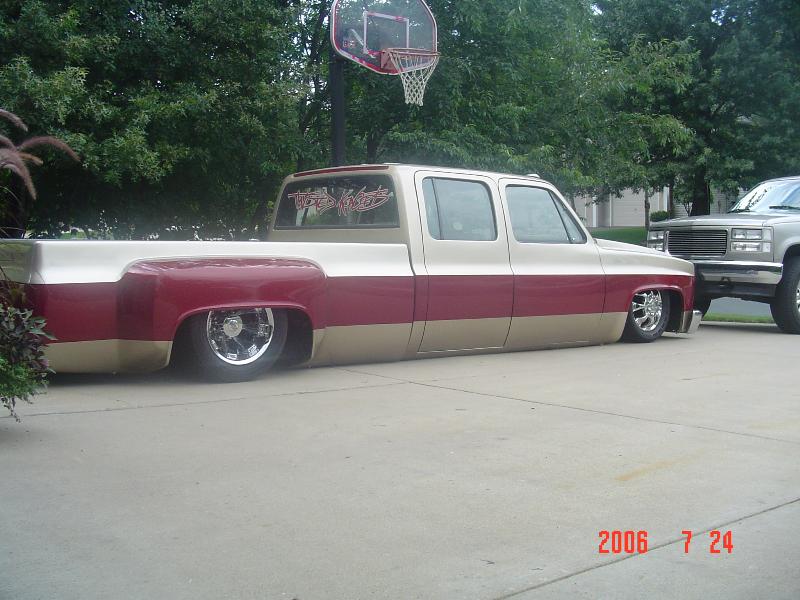 Shaved front and rear marker lights, door handles and key holes, wiper cowl, tail lights, tailgate, both gas doors, stake pockets, upper cab seems, drip rails, fire wall, tailgate and roll pan welded in. Rear flares are molded in. Suicide rear doors, rebuilt inside of bed with square tubing and smoothed it all out, body dropped.Cadillac Seville 3rd brake light, front inner fenders, cowl hood. Two tone Cashmere Biege and Red Fire paint. New suburban grill. Line-X spray-in bed liner