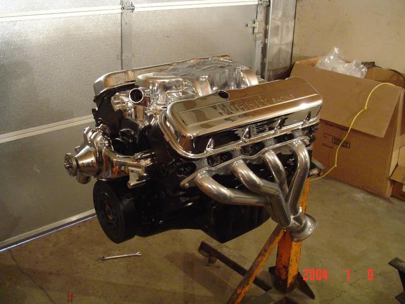 A slightly built big block Chevy with a Turbo 400 and a bunch of chrome and polished shit.