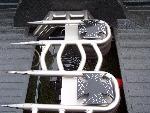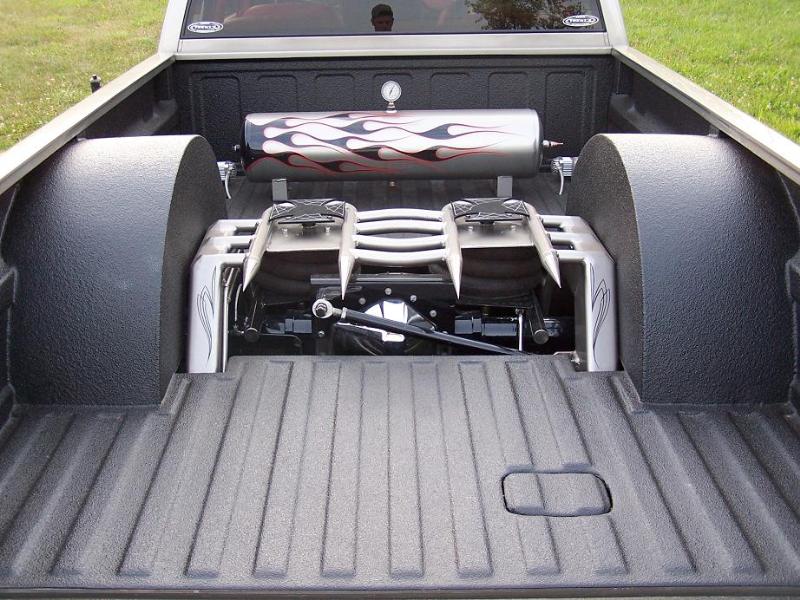 Modified Air Ride Tech. Cool Ride kit with 3600 pheonix bags. Rear parallel 4 link, 2" diameter bars. tripple convolute conitech bags 15" of usable stroke, rear bags mounted upside down so the air line moveswith rear axle, 1/2 parker electric valves, 2 custom painted viair 450 compressors. 3" stock floor body drop, Front frame section raised 1.5" for less ball joint binding, All 3x5 box tubing rear frame, Frame was sand blasted and painted pewter. Hard line stainless fuel, brake, and 1/2" air line. milled spikes in rear of bridge.