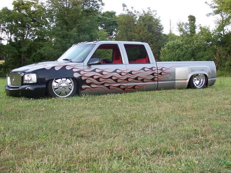 shaved: handles, stake pockets, cadi flair holes,tail lamps,role pan. Denali clip with narrowed 01 silvarado bumper hand built top cap molded in, all GM parts Pro Glass functional ram air hood. High tech LED flushed and cleared into paint. Rear cab body line added. Dually flares stretched. One off laser cut grille. Paint by Air Tight Grafix, Black flames with Ghost wood grain. Inner fenders ditched for wheel tubs in front. bed moved 1" closer to cab. hand fabbed wheel tubs and fuel door, Bed rhino lined black.