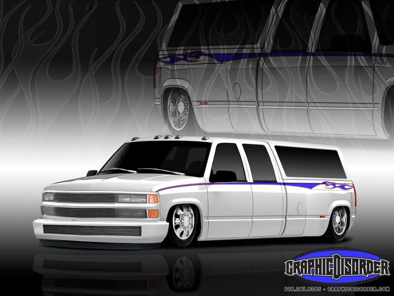 Painted phantom grill with matching bumper, polished wipers, clear front turn signals, and cab lights. Custom hand painted design on the hood,tailgate.