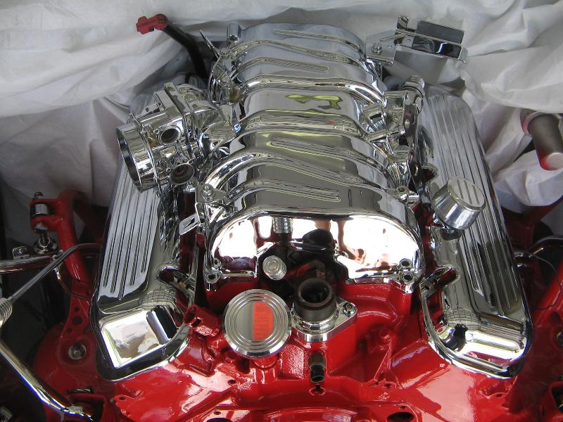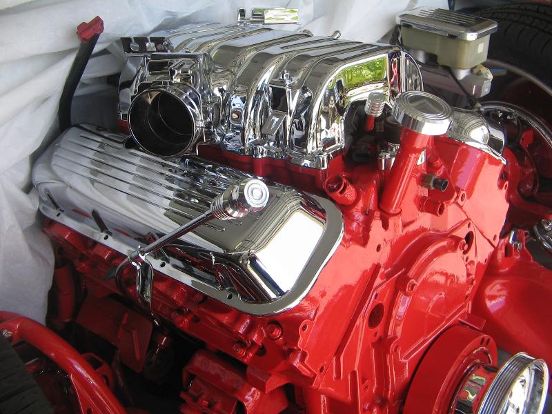 Big Block 454 7.4 vortec painted and smoothed block with all components chromed and powder coated with eddlebrock ceramic coated shorty headers and a lot of one off parts, all chrome done by chrome masters and Advanced Plating