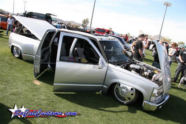 orion silver ,clear Headlights, billet front grill ,all clear marker lights, And a 3ft electric sliding tampon. cadi lights, shaved handles, shaved stakepockets, shaved and sectioned gate, and rollpan. Tilt front hood,One suicide rear door, the other is soon to come. Ok saved the best for last it has a 3 3/4 in body drop to lay the rockers flat on the asphalt.