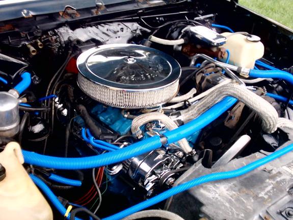 305 v8 chrome valve covers,timing chain cover,air filter,water neck,alternator bracket,alternator,brake fluid cap,blue wireloom,and steel braided hoses.