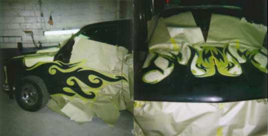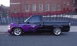 Harwood cowl induction hood,Custom Classic steel molded in rollpan , tinted windows, Tekstyle soft bed cover, Bedrug,Trenz polished billet grill and bowtie,clear corners,diamond back headlights and park lights, TYC black taillights. factory side mouldings, decals,tailgate handle and stake pockets were shaved. House of Kolor Passion purple tribal flames with sky blue outline.