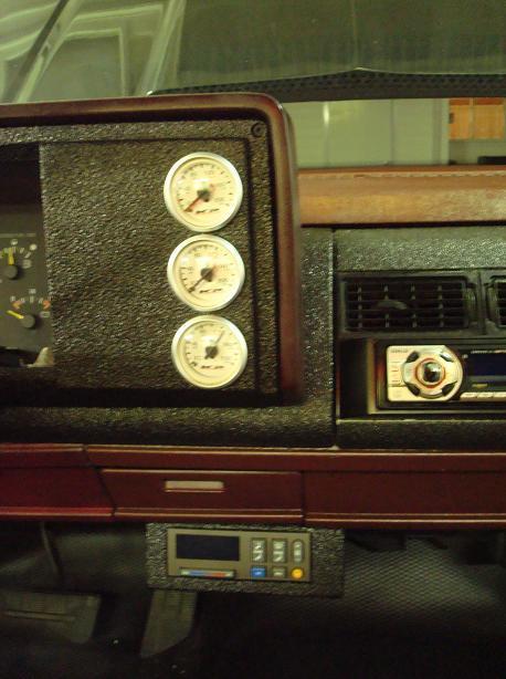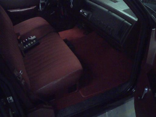 Some trim on the dash smoothed/shaved and line-xed. heat and air controls relocated to make room for three KP air gauges. New seat with shaved head rest, new carpet, and some small nik nak shit...