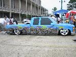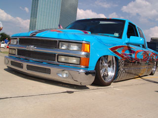 custom paint with graphics,shaved handles, shaved 3rd brake light, shaved antenna, shaved gas door, shaved tail lights and tailgate handle, molded in rear end, supra tail lights, frenched license plate, sliding rag, billet grille and bumper, cowl hood, smoothed bed,etc