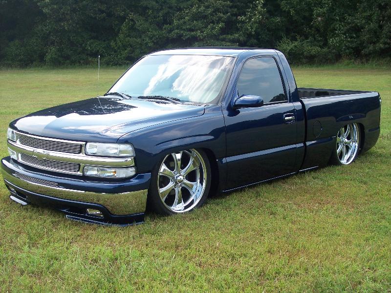 Bagged and stock floor body dropped by ///Jeff Albritton of Diamond State Fabrications ///Mike Sigler, and myself. Custom 2-link in the rear with cross-link bar, Custom bag cup in the front with Belltech 2" drop spindles, 4-Slam Specialties bags, 2-Viar 480 Compressors, 2-5 gallon tanks, 8-3/8 SMC valves, plumbed with 1\2" line and Swagelock fittings. Tanks and compressors are mounted under the bed, and the valves are mounted under the rockers on each side. rearend narrowed 1.5", Devious Customs bodydropped fuel tank.