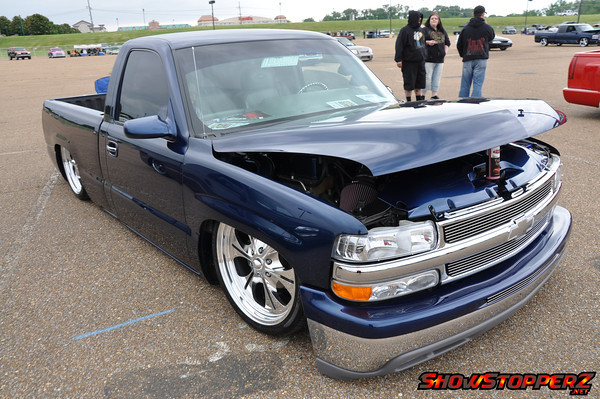 Indigo Blue Metallic, Tahoe chrome grille shell with billet inserts and billet bowtie, clear headlights and park lights, painted top bumper cap, Truckmaster designs front valance, Street Scene mirrors, Escalade door handles, Smoked factory taillights and 3rd brake light, Sir Micheals roll pan molded in, shaved tailgate with some old skool green and silver pinstriping by Perkins, HD hood. The bed floor has been raised 3 inches and has trailer fenders and notch cover all Rhino Lined black.