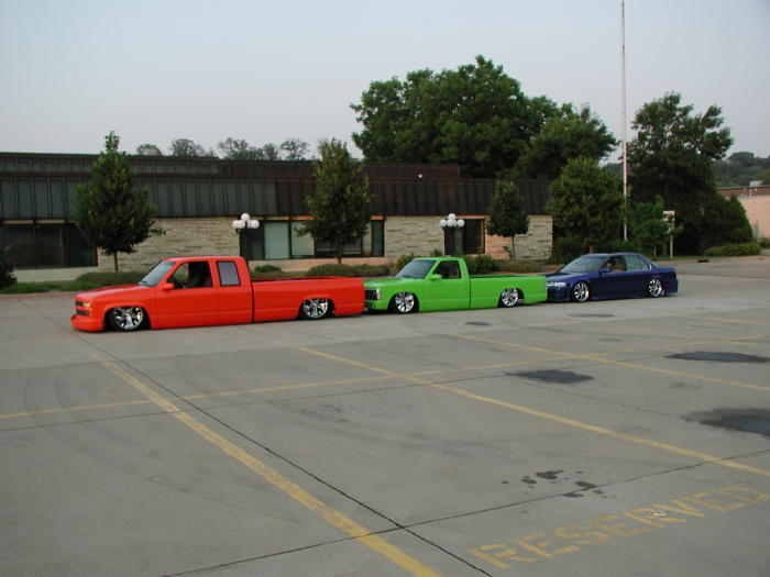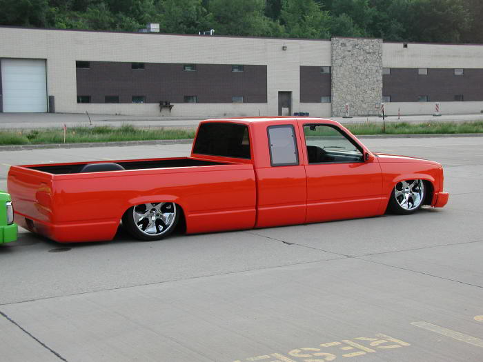 Lowered upper and lower control arms up front, dropped spindles, 2600lb firestone airbags all around, 4 Aplo 3-way electric valves, 1/2" lines, 9 gallon tank, AC Compressor, Rear 4-link setup with custom made bag brackets and shock mounts. 10" C-notch to the rear, and the bed floor remains factory after a 7 3/4" body drop. The cab is Body Dropped 3"