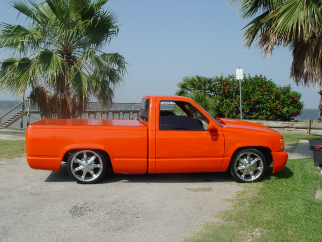 shaved doors, antenna, tail lights, rollpan, tail gate..... caddy front end with billet grill and cowl hood. And im not sure what the color is.