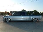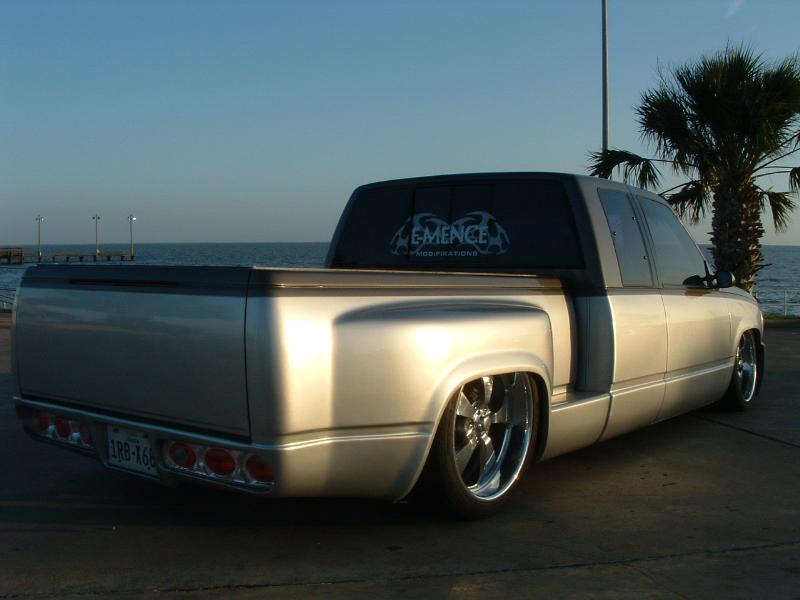 Caddy front clip, shaved door and tailgate handles, shaved 3rd brake light relocated to tailgate bodyline with 24 inch led, shaved taillights and rear step and front step pads, custom rollpan filled with modified 97 integra tails, speed glo mirrors sprayed platinum and silver bunch of scratches and dings