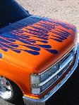 House of Kolor paint, blue base coat and orange flames sprayed by Mike at Unique R.V. and Autoworks. Shaved tailgate handle, third brake light, Sir Michaels rollpan, Street Scene mirrors