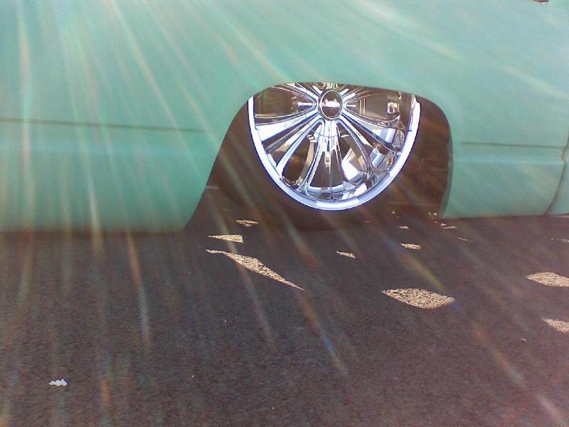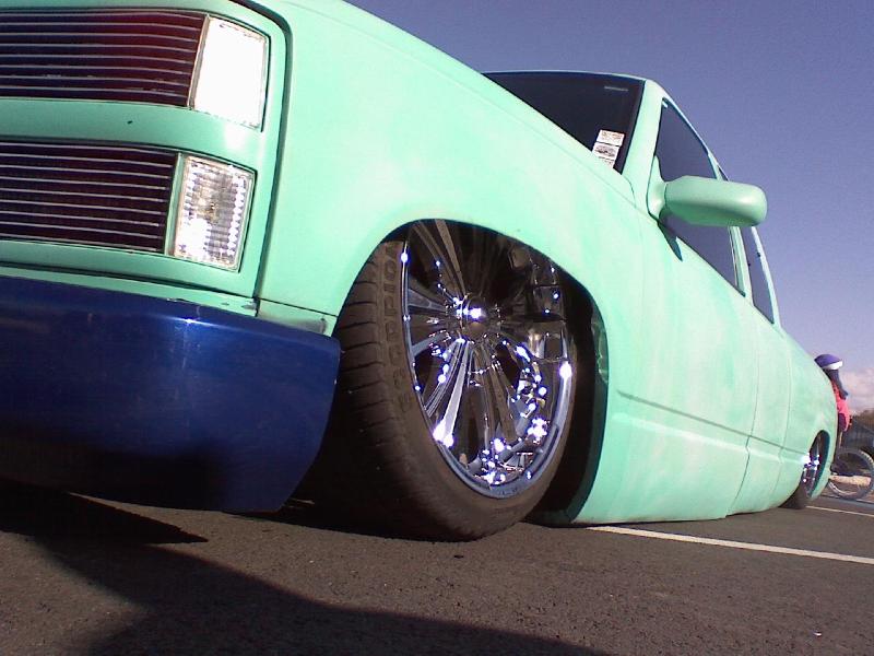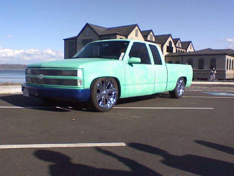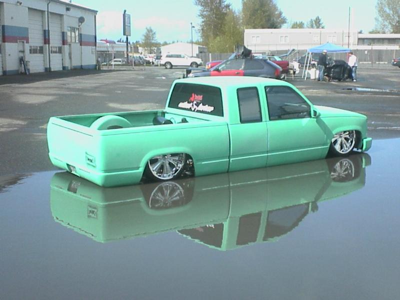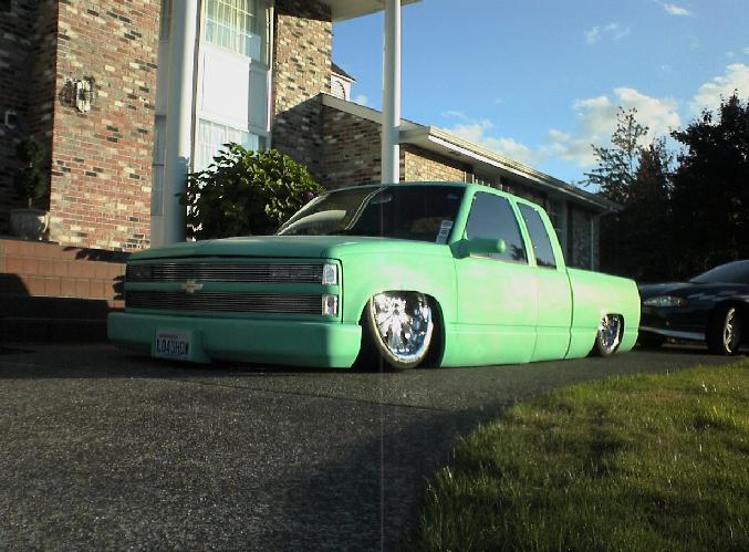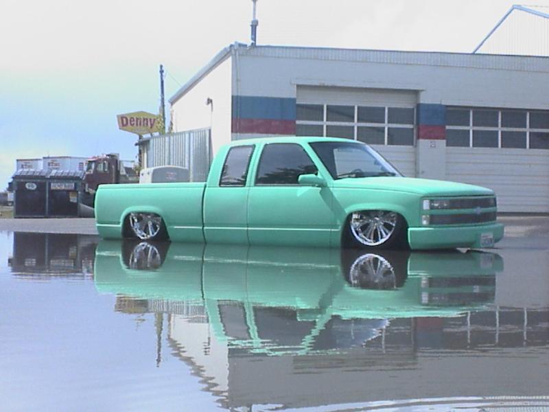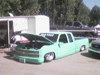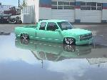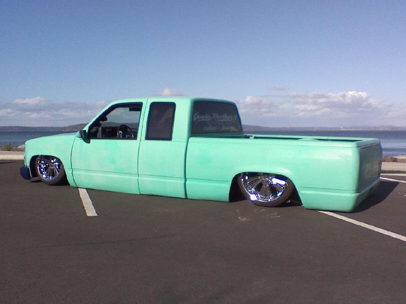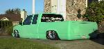 Cali-combo completely shaving taillights, tailgate and rollpan. also shaved gastank door, rocker pannels, stake-post holes, doorhandles, and antenna, frenched license plate box 58" flush mount LED third brake light + LED brake, blinker, and backup light combo down low, phantom billet grill, and smooth steel bumper with frenched license plate box. Smothered in green primer