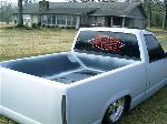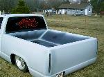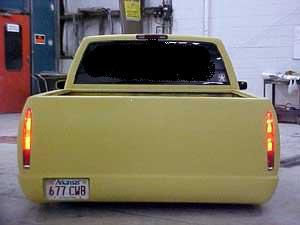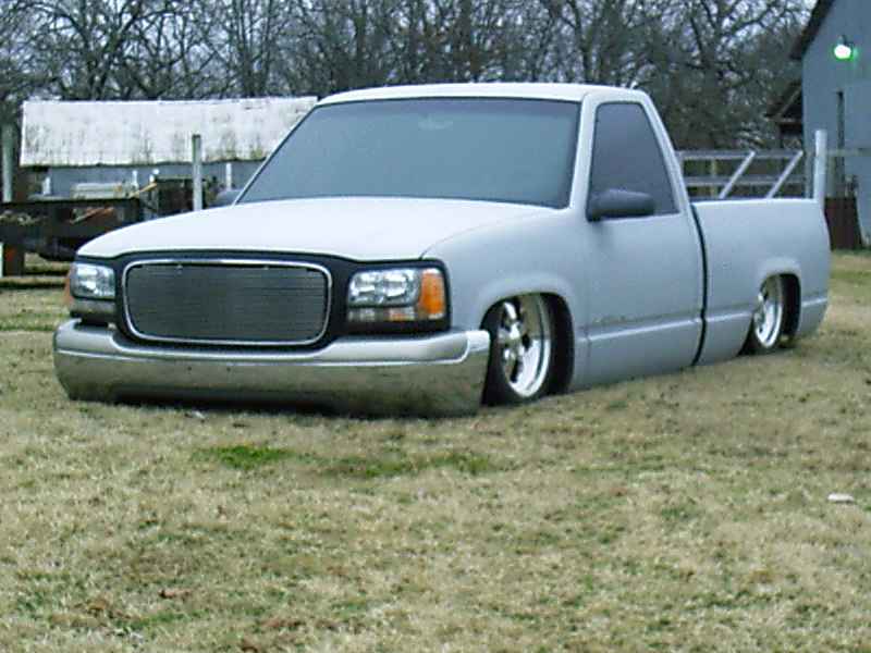 billet bumper and grille, clear corners, cowl hood, shaved ass end, shaved stake pockets,shaved door handles, shaved third brake light, shaved antenna, shaved gas door,caddy tail lights and custom molded bed,oh yeah its body dropped 3"
