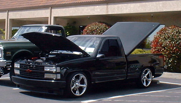 front is lowered 5" with Belltech spindles, springs and nitro drop shocks. Rear is lowered 7" with shackles,hangers, 2" leaf springs and a bell-tech C notch with bell-tech nitro drop shocks. The frame was painted gloss black. Hellwig front/rear anti sway bars. BAGS-Shockwaves/4 link will be installed shortly....