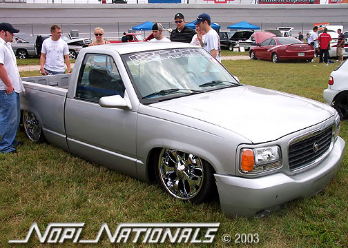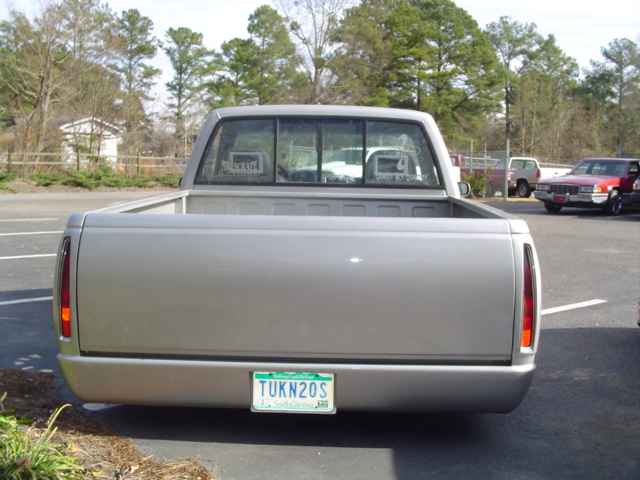 Fully shaved: gas door, stake pockets, taillights, handles, antenna, tailgate handle, and rollpan. Caddy lights out back. Escalade front end swap.