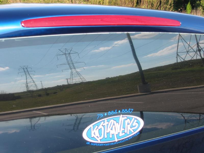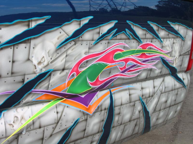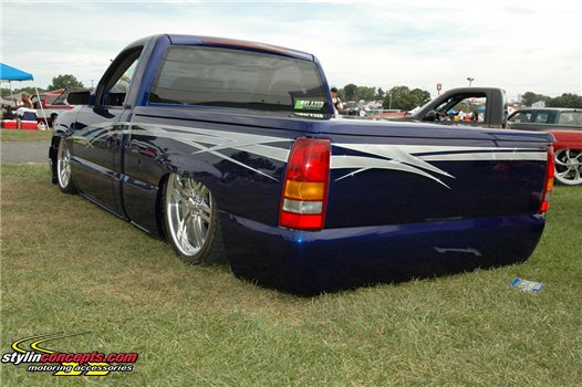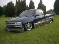Indigo blue with House of Kolor graphics. Suburban front grill shell with billet insert, clears all around, shaved t-gate handle, sir micheals steel roll pan, Gaylords tonneau, bumper color matched with billet insert with chrome valance with billet insert
