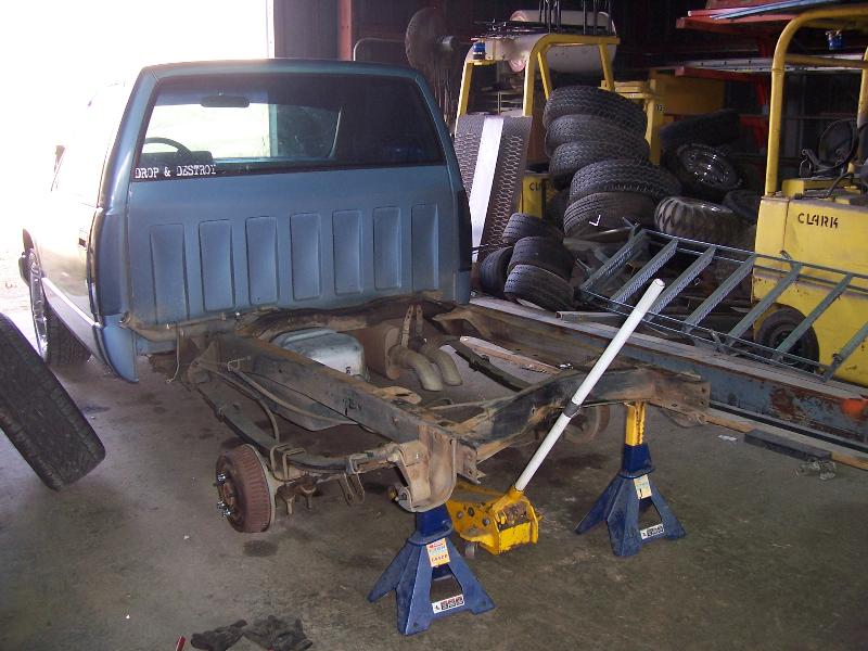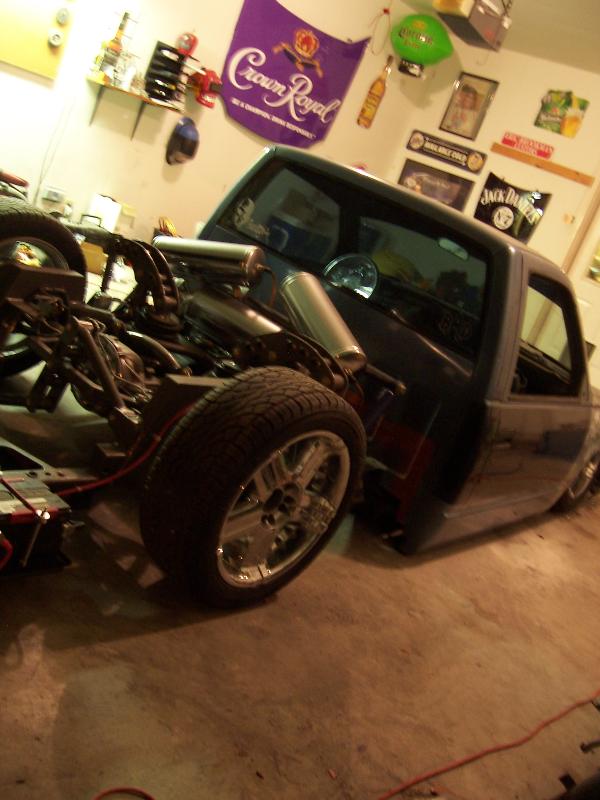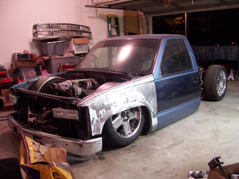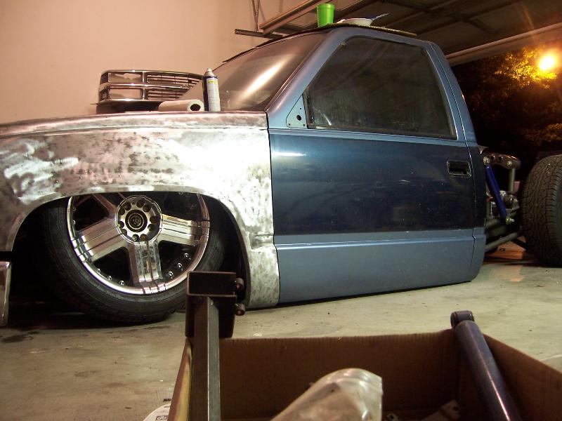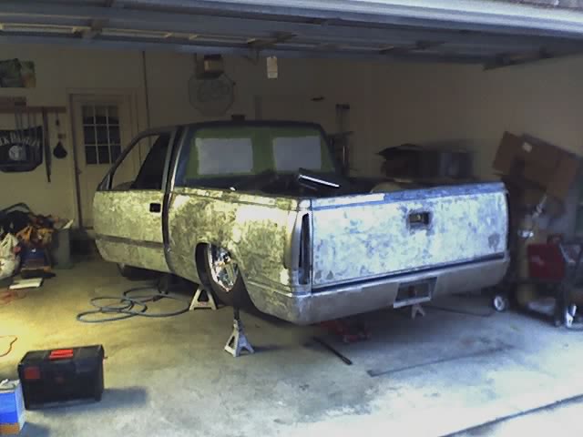 Some ugly old paint that keeps getting more beat up everyday. Sectioned rockers one inch, custom wheel tubs under the hood and in the bed, stock floor bed(well kind of), Bare metal, soon? 99 Deville tail lights, one suicide door (so far).
