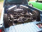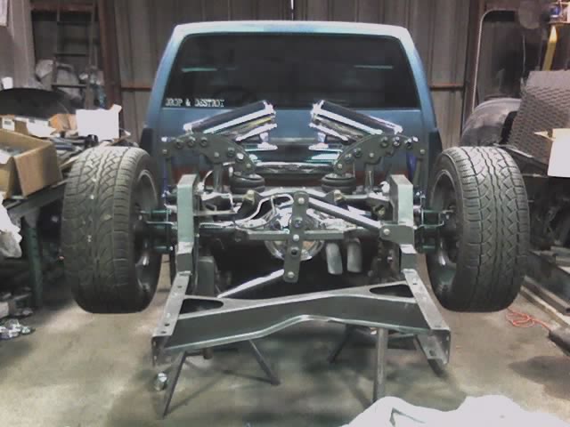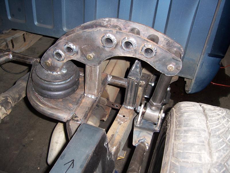 Cantilever rear setup over a raised stock tank, SD parallel 4-link 35" bars, 10" notch, gen 2 bridge, Airlift bags, 2 Viair 380's, 2 SMC watertraps, 8 SMC half-inch valves, 5 gallon 9 port chrome tank, two chrome 3 gallon's, ten switches, and a custom built watt's link (good for over a foot of lift). Monroe shocks all the way around. 20 inch Crow limit straps to limit lift to 18 inches.