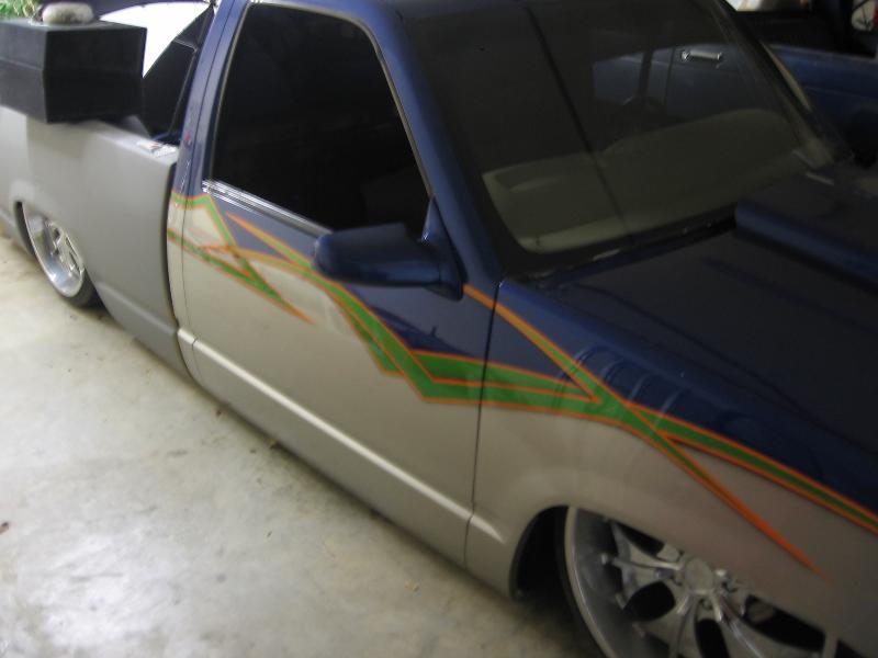 painted hell yea.... caddy blue with silver with lime time green and orange with a hella alot of pearl.....got a nissin hardbody gas tank held in with some bent tubin...shaved everything....firewall, handles,top body line, tailgate, antenna, bed post holes, tail lights, shaved gas door, welded up tailgate, sheet metaled bed..... with hi tech leds for tail lights.... cowl hood, 98 front end update, phatom grill, bumber with billet inserts, and foglights, ss singal mirrors, clear corners and binkers, billet bow tie... that is all i can think of....