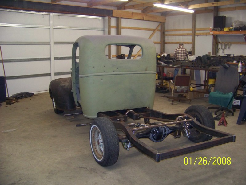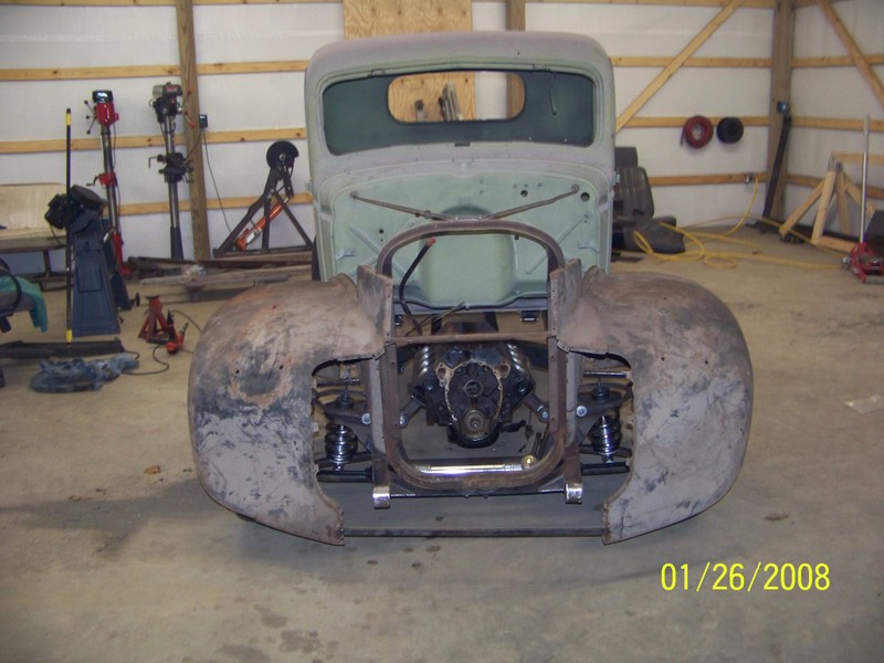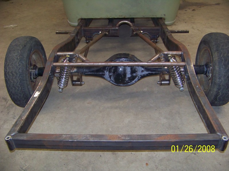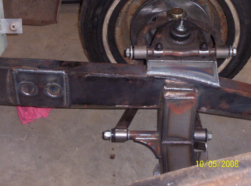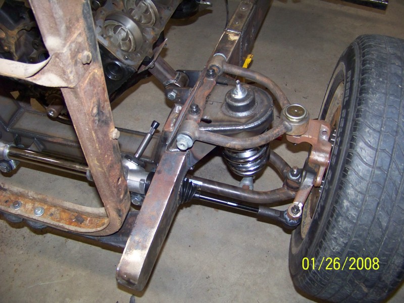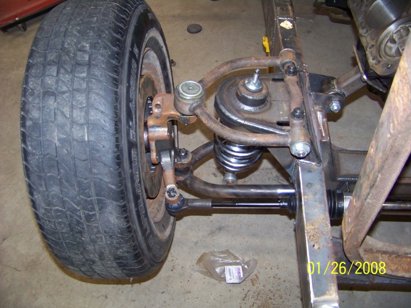 Full frame, coil overs, and mustang II front suspension. 9in ford rearend, Suicide doors 4-Link. All frame work done by Hooies Fab Shop.