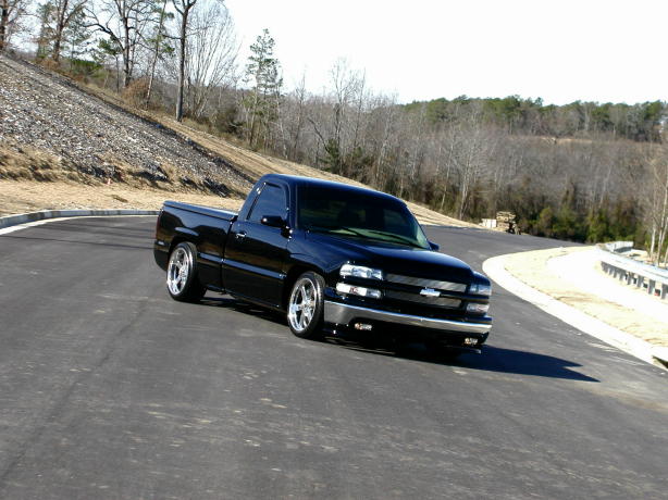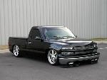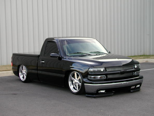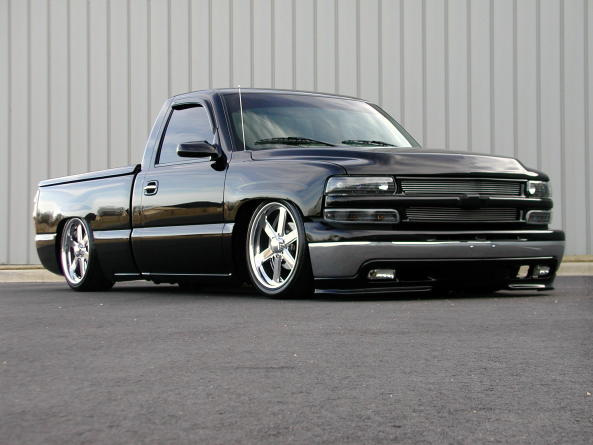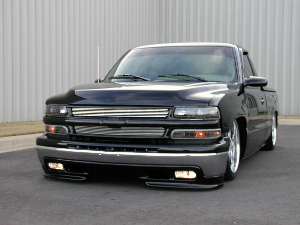 Stull Billet Inserts, Tahoe grille & upper bumper cap, Painted bowtie, Painted Ventshades, Blacked Out Projector Headlights, Blacked Out Corners, Xenon super whites, Trailmaster air-dam, 02'HD hood, Shaved molding & emblems, Billet antenna, SS wiper cowl, SS mirrors, Custom painted calipers, Custom Tinted 03' Tails, Snuglid, Bedrug, Sir Michaels rollpan, Billet Lic. frame. Paint work under hood.