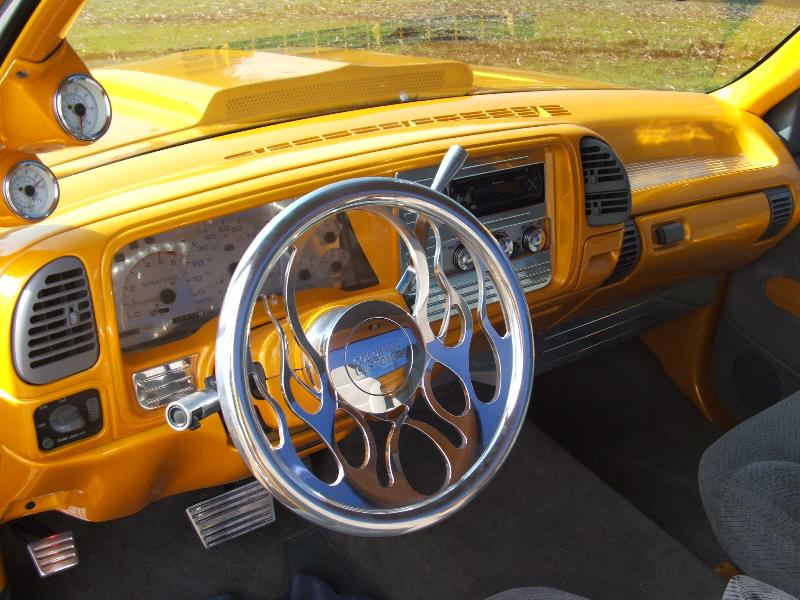 shaved handles, shaved antenna, shaved tailights, shaved 3rd brake light, shaved tailgate handle, teardrop bumper, diamond headlights, gmc full phantom grill, cowl induction hood, 12'' led in place of 3rd brake, tribal light rollpan, lisence plate box in tailgate, custom HOK Sunrise pearl paint with pearl flames and color matched bedliner