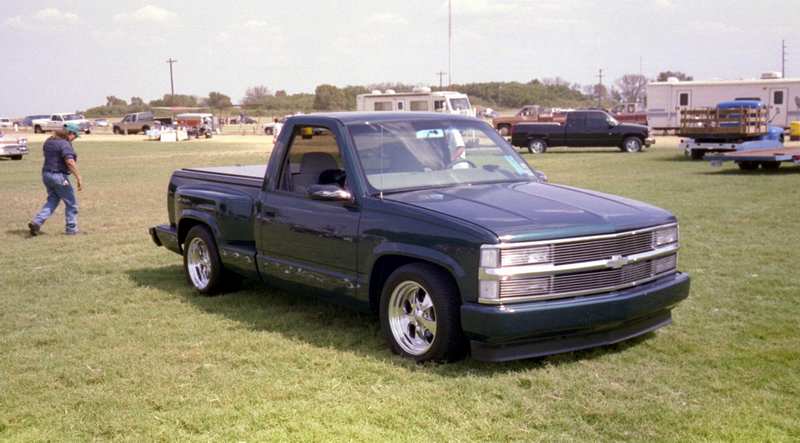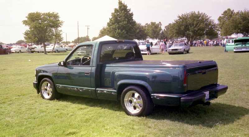Emerald Metallic green with silver and white flame graphics, all trim and mouldings shaved and filled, bumpers and taillight covers match painted, Phantom grill with custom license bracket, clear corners, aluminum bowtie and various accessories, flush fit tonneau cover, street scene mirrors, spray in liner (just tryin to turn some heads)