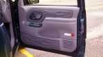 two tone gray leather on tweed with flame design on doors and headliner, silver lizard skin trim, hand made gauges with AutoMeter internals, stock trim pieces match-painted to exterior, various billet trim pieces, Suncatcher light-sensitive window tint (nice and comfy on the everyday commute)