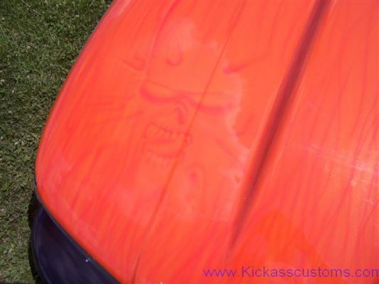 House of Kolor Tangelo Pearl and Black Two-Toned. Airbrushing on 2" Glasstek Hood, Clear Tail Lights.