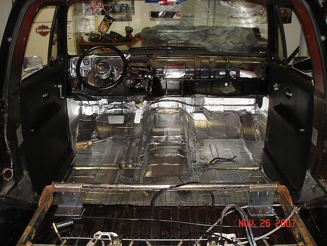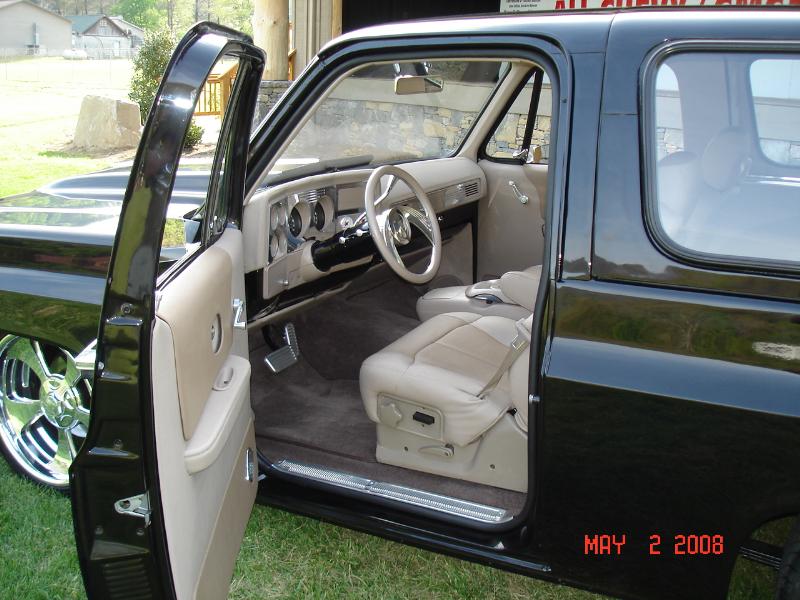 Factory leather seats out of 03 Chevy Suburban / Billet dash pieces, steering wheel, knobs, door handles, window cranks and rearview mirror / center console out of 98 Chevy truck / Factory gauges with factory tach / Custom front Rod Door panels and custom rear panels had to be made / Interior was covered in a tan and light brown vinyl