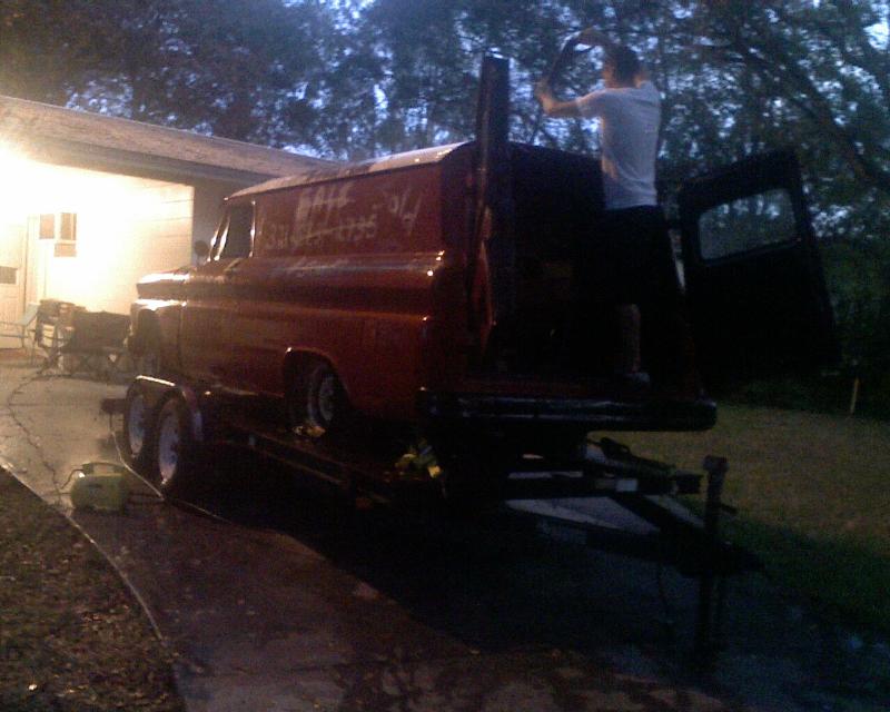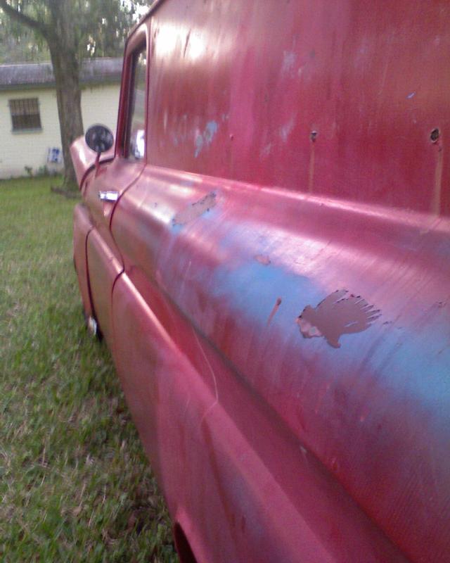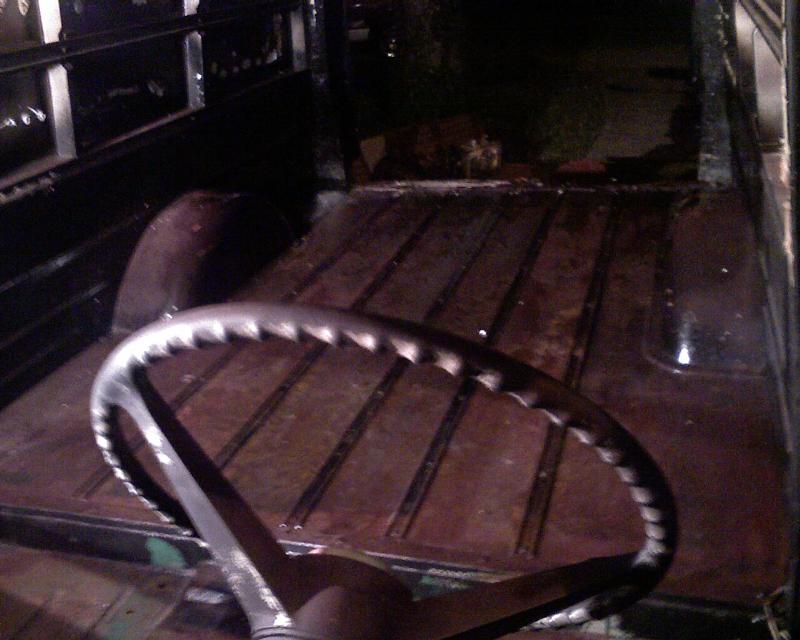 Keep orinal rusty paint, big block of some sort, tranny 4 speed of some sort, orignal wheels painted, white walls, z the front and notch and monoleaf the rear to make it 2" off the ground just static. No bags!!! I'm sure there will be old kegs and old signs involved on the inside. Who knows!