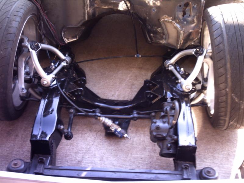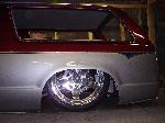 4 1/2" bodydrop. Barnyard upper and lower control arms painted silver. 2500's up front with spindles (All suspension and brakes painted to match).Back-half rear frame with 1990 corvette irs painted candy red(narowed 9"). Cantilever with 2600 lb bags. work done by sean @ seriously insane auto concepts. All paint work done by Donny Schreiner at MaxxMuscle Custom Cycle Painting.