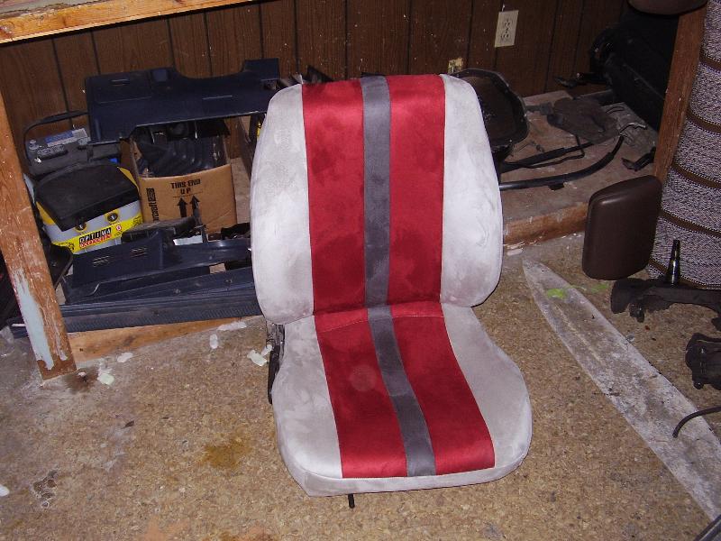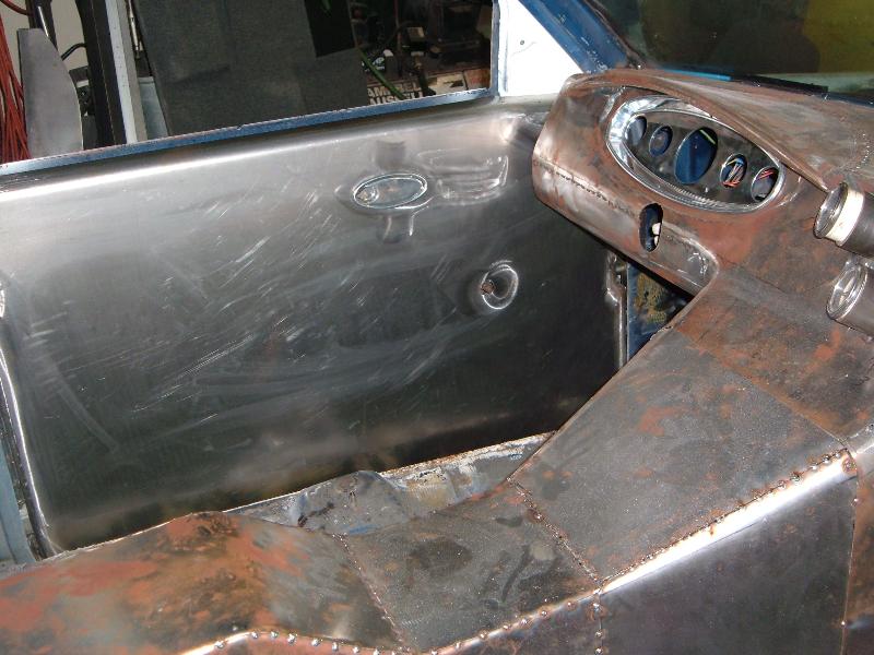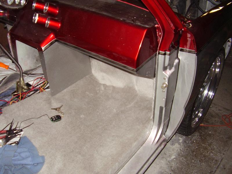 Billet Specialties steering column. Full billet Billet Specialties Vintec steering wheel. Custom sheetmetal dash and console. Lokar cluster, Moon Eyes Gauges. Easy Street Air Gauges. Metal door panels with Lokar door handles. Lokar shifter. Lokar Eliminator Floor Mount Gas Pedal, with matching Lokar Brake Pedal Pad, and Lokar Dimmer Switch Cover. Sheet metal interior done by sean@ seriously insane auto concepts. All paint work done by Donny Schreiner of MaxxMuscle Custom Cycle Painting. Julianos airplane style lap belts. Seats and headliner covered by David Corn at Pro Stitch Custom Interiors. Seats covered in red and grey suede with a dark grey strip in the middle to match the paint scheme. Silver carpet also done by David Corn.