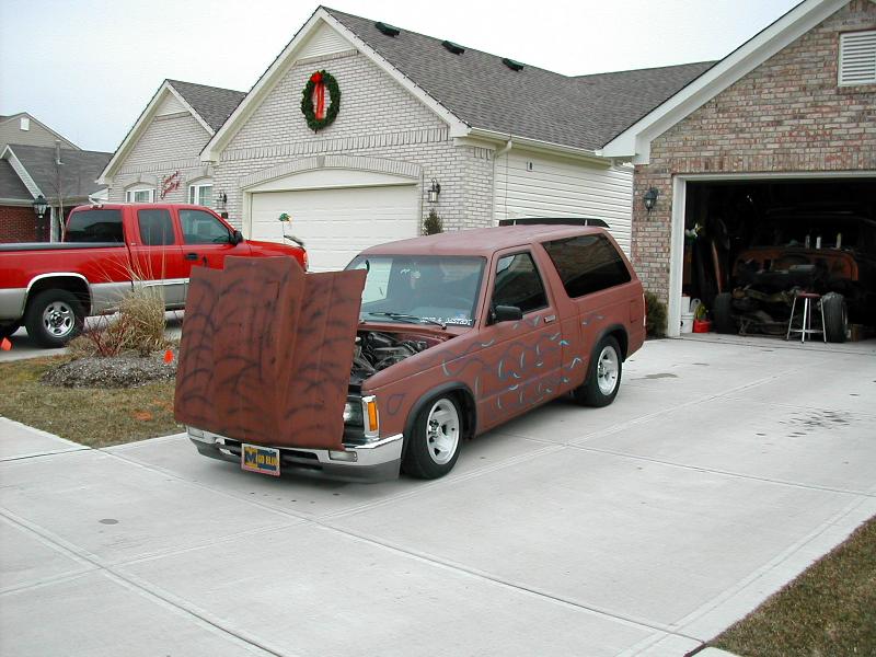 working on it,shaved roof rack,role pan,shaved cowl,gmc grill,french tag in tail gate,toyota bumper and valance,suicide hood