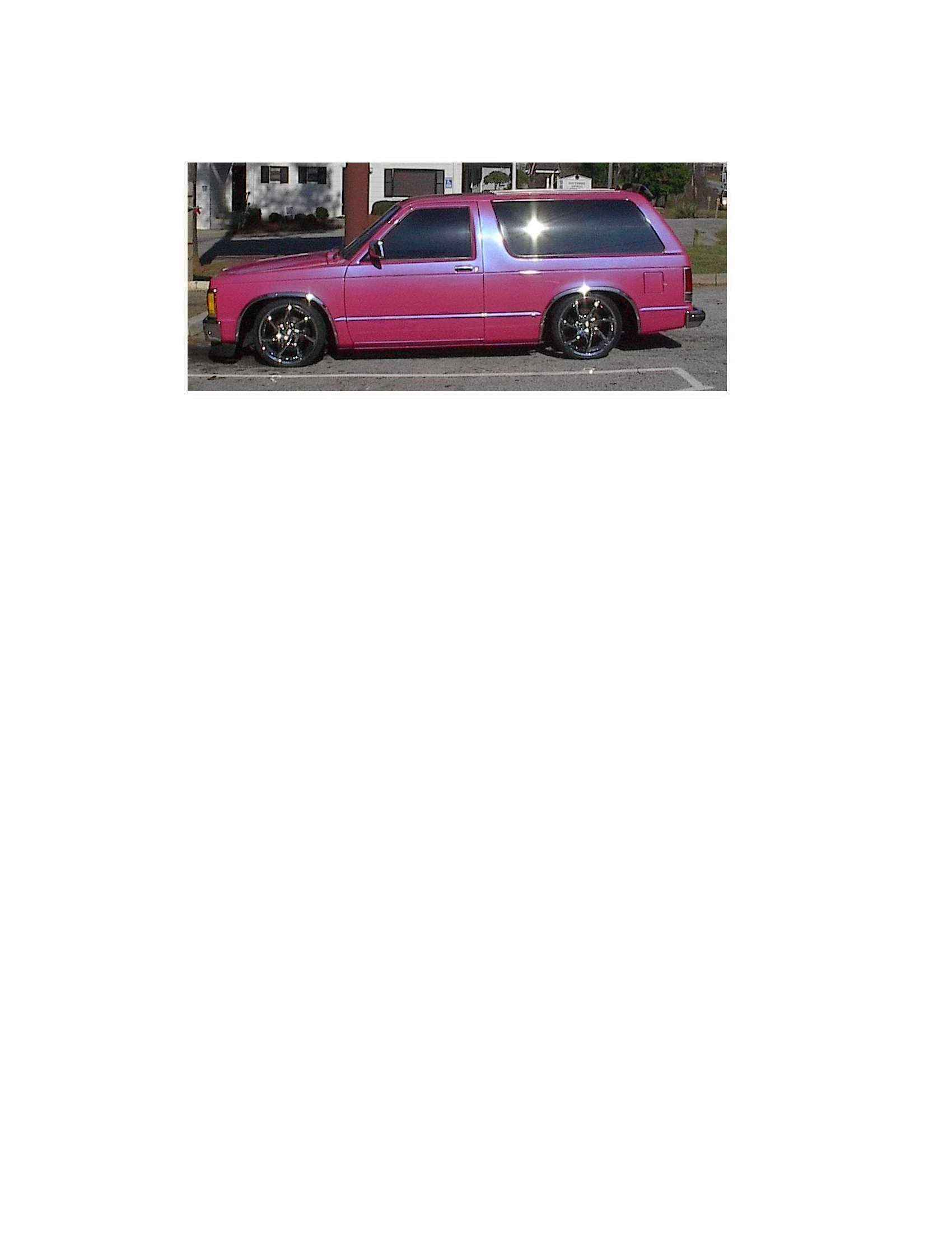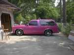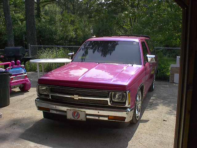 Pepto Bismol pink (NO I'M NOT GAY) with a blue pearl 93 chrome grill w/billet insert, a shaved roof rack, & emblems COMPLETE SHAVE COMING SOON DID I MENTION THIS IS UNDER RECONSTRUCTION
