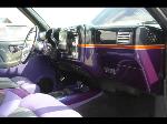 painted dash, billet inserts, billet steering wheel, painted and vinyl wrapped interior panels, vinyl and leather wrapped seats, fiberglass stereo enclosure and amp rack
