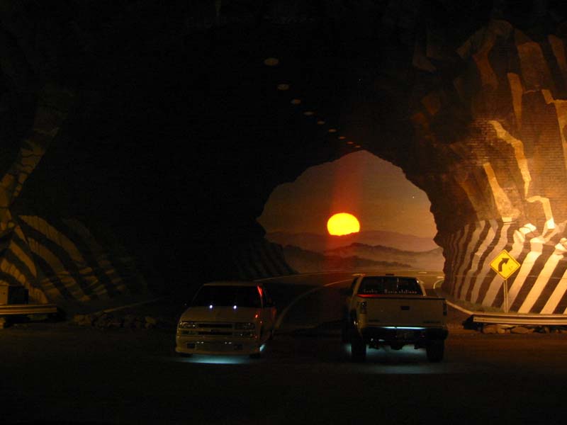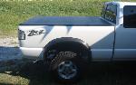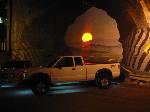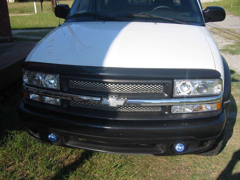BMW style projector headlights, euro wipers, Exotic decal, blacked out windows, toneau cover, blue powder coat calipers, clear corners, clear brake lights, flame 3rd brake light cover, white APC washer lights, white underbody neons, shaved emblems, BedRug bed carpet, Street Scene custom grill, Street Scene front valance, billet chevy bowtie, rollpan with hidden hitch and flip up license plate