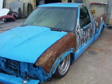 shaved doors, wiper on ps, roll pan, hightec leds, smoothed bed inside and raised floor, smoothed back of cab and front of bed wall. cowl hood, 2000 sonoma front end. shved mirrors, tail is shaved but functional to access valves. bed floor has acces doors for fuel and battery.