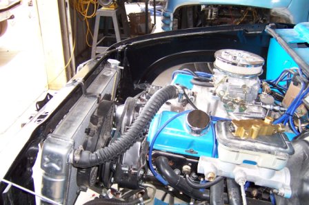 350 crate motor w/ 700r tranny. shift with B&M shifter and 2500 torque converter. valve covers painted to match and some chrome goodies, altenator, pullies, dip stick etc. edelbrock carb.