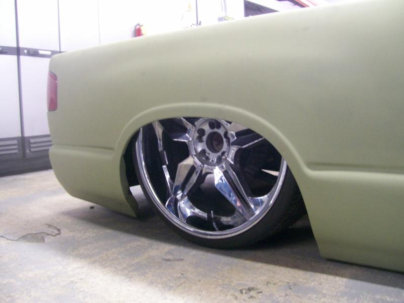 shaved side mirrors, phantom grille, grant kustoms front bumper, isuzu fenders w/ shaved corners, sheet metal bed with tear drop tubs,one off gussets by MMW at all four corners,and a smooth grant kustoms skin