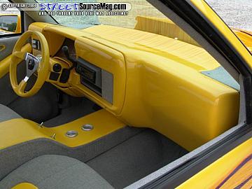 Smoothed and painted dash with billet inserts. Steering wheel installed to match dash! Tweed everything from headliner to floor, with vinyl inserts in door panels and custom made console which is also home to airbag controls covered in tweed and vinyl. Saturn bucket seats covered in tweed also with vinyl inserts. Billet inserts throughout interior. Smoothed glove compartment and Shaved air vents.